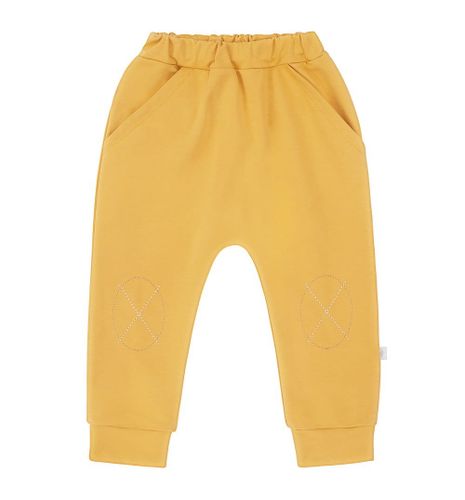 Wygodne, długie spodnie dresowe uszyte z wysokiej jakości bawełny sprawdzają się doskonale w codziennym użytkowaniu. Nie krępują ruchów, nie uwierają i dopasowują się do maluszka. Elastyczna gumka w pasie nie uciska brzuszka. Spodnie mają dwie otwarte kieszonki i dekoracyjne przeszycia na kolanach. Musztardowy odcień pięknie komponuje się z brązem, zielenią, granatem i wieloma innymi kolorami, więc stworzenie stylizacji z tymi spodenkami będzie czystą przyjemnością.