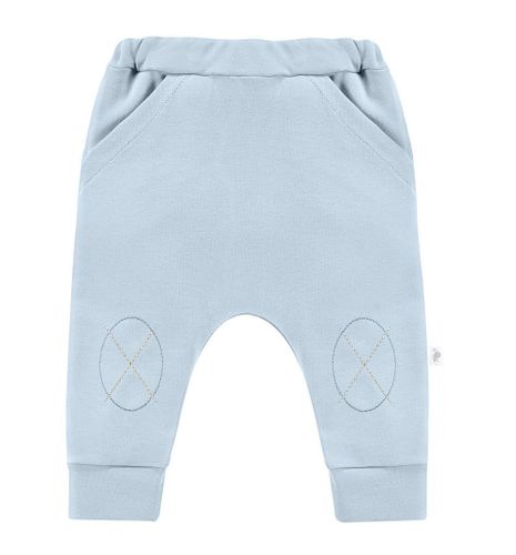 Niemowlęce spodnie dresowe uszyte z wysokiej jakości bawełny. Są bardzo mięciutkie, a przy tym elastyczne i bardzo wygodne. Spodnie mają gumkę w pasie i dwie małe kieszonki. Kolana ozdobione zostały imitacją łatek. Krój z delikatnie zwężanymi nogawkami wspaniale sprawdza się w codziennym użytkowaniu i nie krępuje ruchów. Takie uniwersalne, błękitne spodnie na pewno będą często wykorzystywane do codziennych stylizacji. Niezależnie od tego czy zostaną połączone z jednolitą bluzeczką basic czy też z kolorowymi body z nadrukiem, zawsze będą wyglądały bezbłędnie!