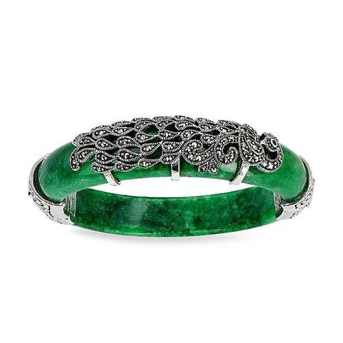 Staviori Bransoleta 19cm. Jadeit. Markazyty. Srebro 0,925. Szerokość 12 mm. Grubość 8 mm. Przepiękna, jadeitowa bransoletka ze srebrnymi elementami i wspaniale mieniącymi się markazytami. Przepiękna zieleń naturalnego jadeitu sprawia, iż nie da się przejść obok niej obojętnie. Cudowna rzecz. Małe jubilerskie dzieło sztuki.