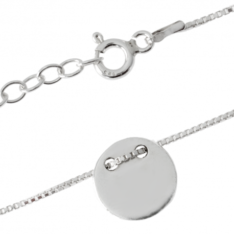 Bransoletka wykonana z łańcuszka typu wenecjana o długości 19cm lub 20cm (do wyboru). Zdobiona blaszką w kształcie koła. Wykonana w całości ze srebra próby 925. Gładki poler daje jej piękny blask.