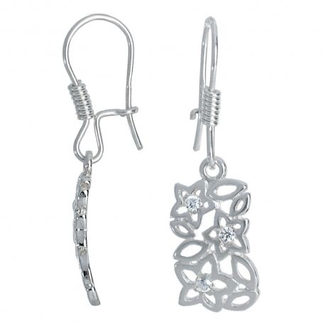 Pięknie lśniące, ażurowe kolczyki wiszące na zapięciach typu ruchomy bigiel. Ozdobiono je kwiatowym motywem i drobnymi, błyszczącymi cyrkoniami. Ozdoby są niezwykle trwałe za sprawą użycia do ich produkcji wysokiej jakości srebra o próbie 925. Dostępne również w zestawie subtelnej biżuterii, która jest świetnym pomysłem na urodzinowy czy imieninowy podarunek.