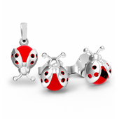 Wyjątkowy komplet srebrnej biżuterii o oryginalnym wzorze. Zawiera kolczyki zapinane na sztyft z barankiem i wisiorek w kształcie biedronek. Ozdoby wykonano z wysokiej jakości srebra i ozdobiono okazałymi czerwonymi kamieniami. Biżuteria ta z pewnością przypadnie do gustu zarówno dzieciom, jak i dorosłym interesującym się naturą, a w szczególności owadami.