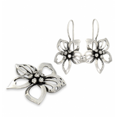 Reprezentacyjny, oksydowany zestaw biżuterii w kształcie kwiatów, stworzony z najlepszej jakości srebra o próbie 925 i ozdobiony pięknie lśniącymi cyrkoniami kunsztownie zakutymi w centralnych punktach ozdób. W skład kompletu wchodzą eleganckie kolczyki oraz okazały wisiorek. Kolczyki posiadają zapięcie typu sztywny bigiel, a zawieszkę wisiorka umieszczono na jej odwrocie. Będzie to idealny wybór dla osoby lubiącej wiosenne spacery wśród kwiatów. Obdaruj nim ukochaną osobę.