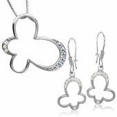 Delikatne motyle dla każdego miłośnika natury. W skład kompletu wchodzą kolczyki zapinane na ruchomy bigiel oraz pięknie błyszczący wisiorek ze sprytnie zaprojektowaną zawieszką. Całość wykonana została z wysokiej jakości srebra o próbie 925 oraz ozdobiona drobnymi, białymi cyrkoniami, które dodają biżuterii niesamowitego blasku.