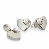 Oryginalny komplet w nowoczesnym stylu wykonany ze srebra o próbie 925 oraz ozdobiony perłami o średnicy 6 mm. W skład którego wchodzą kolczyki i wisiorek w kształcie serduszek. Kolczyki wyposażono w zapięcia typu sztyft z barankiem. Doskonały zestaw na prezent dla ukochanej osoby.