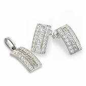 Ślicznie błyszczący komplet biżuterii w greckim stylu, wysadzany licznymi, drobnymi cyrkoniami w białym kolorze. Zestaw zawiera wisiorek i kolczyki zapinane na sztyft z barankiem, wykonane ze srebra o próbie 925. To doskonały pomysł na prezent dla ukochanej osoby. Oryginalny wzór, perfekcyjne wykonanie i użyty materiał zapewniają wysoką jakość i trwałość ozdób.