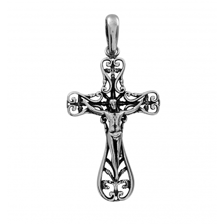 Okazały, ażurowy krzyż przedstawiający ukrzyżowanego Jezusa Chrystusa.