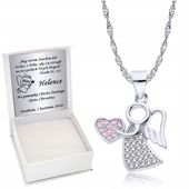 Ten wyjątkowy srebrny łańcuszek z wisiorkiem w kształcie aniołka, wysadzanym błyszczącymi cyrkoniami, oraz serduszkiem zdobionym różowymi cyrkoniami, to kwintesencja subtelnego luksusu. Wykonany w całości z najwyższej jakości srebra próby 925, cechowany zgodnie z polskim prawem probierczym, zapewnia trwały blask i niezawodne noszenie na co dzień, idealnie podkreślając osobisty styl.