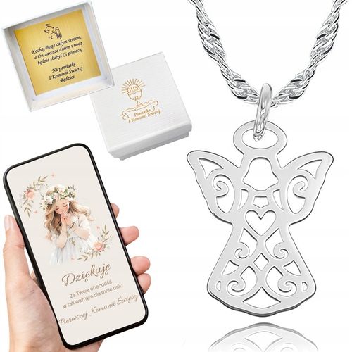 Ten srebrny łańcuszek z wizerunkiem anioła to doskonały wybór na prezent z okazji Komunii Świętej. Wykonany z najwyższej jakości srebra próby 925, gwarantuje trwałość i elegancję, podkreślając wyjątkowy charakter tej uroczystości.