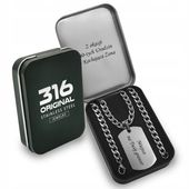 Zestaw gwarantuje niezawodność dzięki antyalergicznym właściwościom stali szlachetnej, która nie czernieje ani nie śniedzieje, nawet po długim użytkowaniu. Łańcuszek o splocie pancerka o szerokości 6 mm i długości 60 cm (z opcją skrócenia) oraz nieśmiertelnik o wymiarach 40x23 mm i grubości 2 mm tworzą harmonijną całość, odporną na korozję i zmiany kształtu.