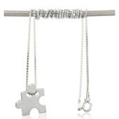 Naszyjnik wykonany z łańcuszka typu wenecjana o długości 45 centymetrów. Zdobiony blaszką w kształcie lśniącego puzzla. Wykonany z wysokiej jakości srebra próby 925. Dzięki kunsztownemu polerowi ozdoba ślicznie mieni się w padającym na nią świetle.