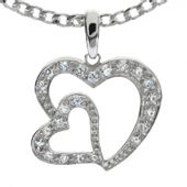 Dwa połączone ze sobą, błyszczące serduszka w formie eleganckiego wisiorka o niezwykłym kształcie wykonanego ze srebra o próbie 925. Dzięki precyzyjnie zakutym, drobnym, białym cyrkoniom ozdoba niesamowicie lśni w promieniach światła i prezentuje się bardzo okazale.