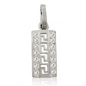 Oryginalny, lekko wypukły wisiorek o podłużnym kształcie i wzorze w greckim stylu wykonany z wysokiej jakości srebra o próbie 925. Dodatkowego uroku dodaje mu kunsztowne zdobienie składające się z drobnych, białych cyrkonii. Idealna ozdoba do Twojej greckiej kolekcji biżuterii.