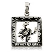 Srebrny wisiorek przedstawiający znak zodiaku - RAK. Zdobiony po obwodzie wzorem greckim. Wykonany został w całości ze srebra próby 925. Dodatkowo pokryty oksydą by podkreślić każdy detal wisiorka.