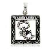 Srebrny wisiorek przedstawiający znak zodiaku - SKORPION. Zdobiony po obwodzie wzorem greckim. Wykonany został w całości ze srebra próby 925. Dodatkowo pokryty oksydą by podkreślić każdy detal wisiorka.