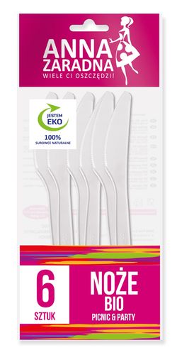 Noże BIO są produktem przyjaznym dla środowiska. Jest to ekologiczna alternatywa dla jednorazowych sztućców plastikowych. Noże BIO są wyjątkowo mocne i wytrzymałe, idealnie sprawdzają się przy zarówno zimnych jak i ciepłych potrawach. Doskonałe podczas towarzyskich spotkań na świeżym powietrzu jak i w domowym zaciszu. Są wykonane z mączki kukurydzianej, która jest tworzywem wytwarzanym z odnawialnych surowców roślinnych, jest surowcem w 100% kompostowalnym i biodegradowalnym, który ulega rozkładowi do 6 miesięcy. Temperatura użytkowa do 70°C. Produkt jednorazowego użytku. Opakowanie posiada praktyczną tasiemkę umożliwiającą wielokrotne zamykanie i otwieranie, a w opakowaniu znajduje się 6 noży w kolorze białym.
