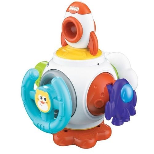 Misja kosmiczna - ćwiczenie sprawności paluszków! Ta wielofunkcyjna zabawka wyposażona jest w wiele praktycznych zadań, z którymi dziecko może ćwiczyć motorykę małą. Znajduje się tu obrotowy ster, samolocik do przesuwania, wtyczka do wciskania, piszcząca chmurka, a także obrotowa gwiazdka, która jest zarazem ścianką, będącą podstawą zabawki. Po ustawieniu Stacji Kosmicznej na gwiazdce, można nią kręcić za pomocą paluszka. Kompaktowy rozmiar zabawki pozwala korzystać z niej zarówno w domu, jak i podczas podróży.
