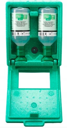 Stacja jest wyposażona w dwie fabrycznie zamknięte i sterylne butelki 500ml roztworu do przemywania oczu. Nakrętki chronią wyloty przed zakurzeniem, a produkt posiada znak CE, co potwierdza jego zgodność z rygorystycznymi przepisami dotyczącymi sprzętu medycznego.