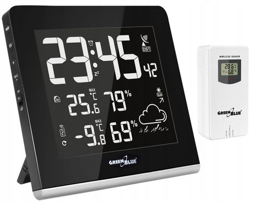 Nowoczesna stacja pogody z dużym, czytelnym wyświetlaczem. Niezawodna, elegancka i prosta w obsłudze. Bezprzewodowy czujnik temperatury zewnętrznej o zasięgu do 60 m. Czujnik wyposażony w ekran ciekłokrystaliczny, na którym są wyświetlane temperatura i wilgotność. Wysoka jakość gwarantowana przez renomowanego producenta. Radiowa kontrola czasu DCF.
