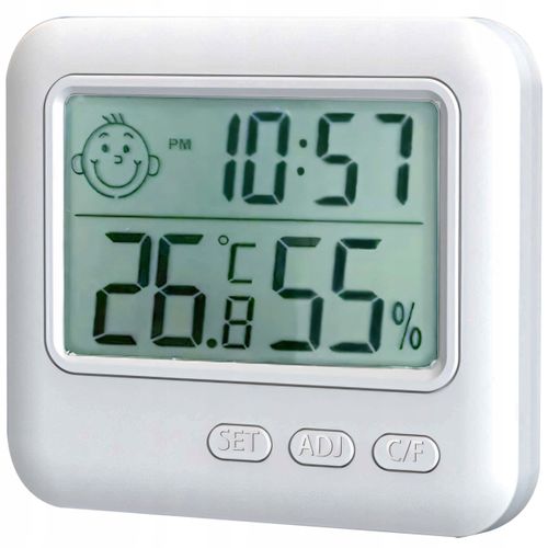 Wygodny przyrząd do codziennego kontrolowania temperatury w pomieszczeniu. Posiada również dodatkowe funkcje zegarka z budzikiem. Produkt wyposażony został w wygodny do odczytywania wyświetlacz LCD. Wykonany z tworzywa sztucznego w kolorze białym, pasuje do wnętrz z wyposażeniem o różnej kolorystyce.