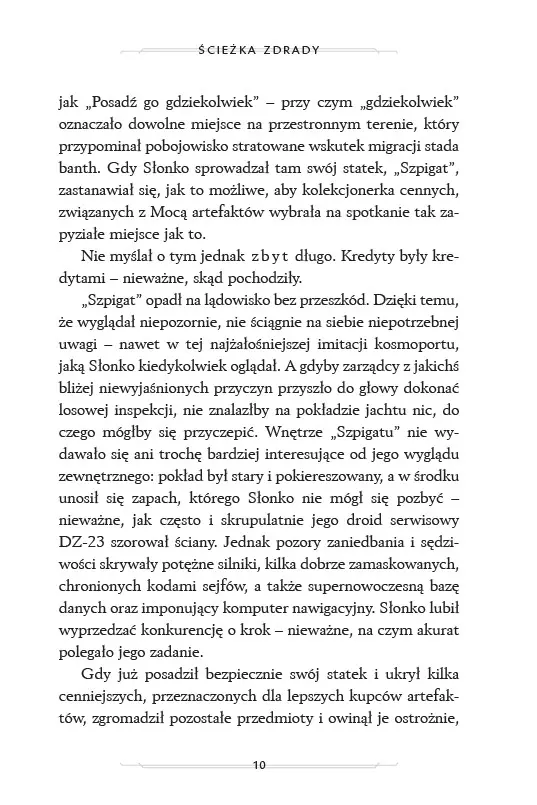 Era zmian zwiastuje nowe nadzieje i możliwości... Ale i nieznane zagrożenia Jedi zostają wezwani na planetę Dalna, znajdującą się na Zewnętrznych Rubieżach, aby przeprowadzić śledztwo w sprawie skradzionego artefaktu Mocy. Rycerka Zallah Macri i jej padawan Kevmo Zink przybywają na ten sielski, rolniczy świat, pragnąc zbadać potencjalny związek kradzieży z dalnańską grupą misjonarzy nazywających siebie Ścieżką Otwartej Dłoni. Członkowie Ścieżki głęboko wierzą, że Moc musi być wolna i nikt, nawet Jedi, nie powinien jej używać. Do ich szeregów należy między innymi Marda Ro, młoda kobieta, marząca o opuszczeniu Dalny, aby głosić słowo Ścieżki w całej galaktyce. Kiedy Marda i Kevmo się spotykają, natychmiast łączy ich niewytłumaczalna, silna więź… Dopóki Marda nie odkrywa, że Kevmo należy do zakonu Jedi. Ale padawan wydaje się taki miły i chętny, by dowiedzieć się więcej na temat samej Ścieżki, że Marda ma nadzieję, iż uda jej się przekonać go o słuszności własnych poglądów. Dziewczyna nie zdaje sobie jednak sprawy z tego, że przywódczyni Ścieżki, charyzmatyczna kobieta znana jako Matka, ma własny plan, a Jedi stanowią dla niej przeszkodę, której zamierza się pozbyć – za wszelką cenę. Jeśli Marda chce pozostać wierna własnym przekonaniom, może stać się najgorszym wrogiem swojego nowego przyjaciela… Ścieżka zdrady to pierwszy tom kolejnej fazy Wielkiej Republiki, której akcja rozgrywa się 150 lat przed wydarzeniami opisanymi w powieściach Światło Jedi, Burza nadciąga i Gasnąca gwiazda.