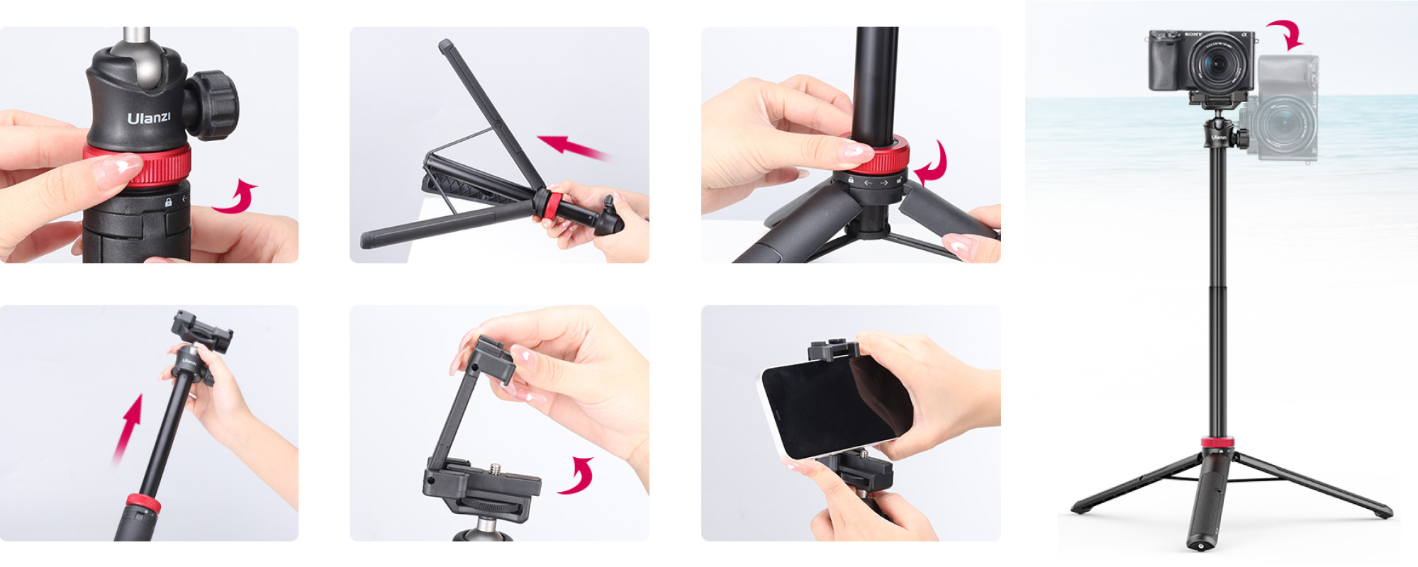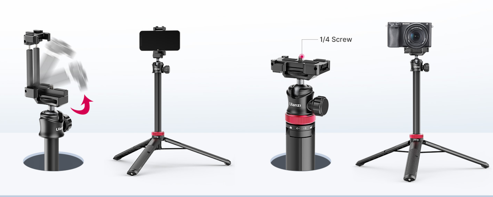 Ulanzi MT-44 wyposażono w sprytnie ukryte mocowanie na telefon, zintegrowane bezpośrednio z głowicą. Nie musisz zabierać ze sobą dodatkowych akcesoriów – wystarczy rozłożyć uchwyt i od razu możesz zamocować smartfon. Będzie odpowiedni do pracy z urządzeniami o szerokości od 6 do 8 cm. Jeśli zamiast telefonu chcesz zamontować aparat, kamerę sportową lub lampę LED – wystarczy nie rozkładać uchwytu i skorzystać ze standardowego gwintu 1/4 cala.