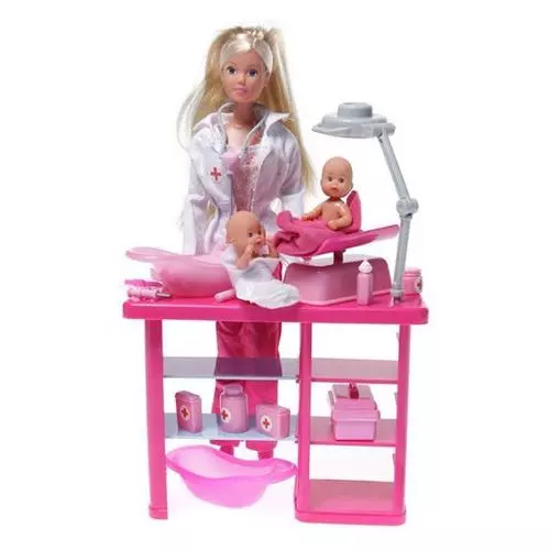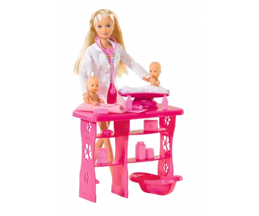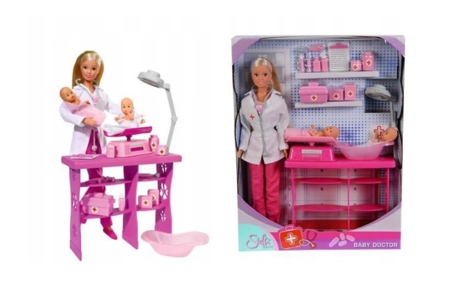Stefii jako pediatra zajmuje się słodkimi bobasami – trzeba je zbadać, umyć i zważyć. Pomóż lalce zaopiekować się maluchami! W zestawie – poza lalką Stefii i lalkami-niemowlakami – znajduje się wiele akcesoriów, w tym: strzykawka, notatnik, butelka do karmienia, apteczki, lekarstwa, termometr oraz specjalny stół. To wiele możliwości kreatywnej zabawy oraz idealny pomysł na prezent! Wymiary opakowania: 32.8 x 25.0 x 7.5 cm