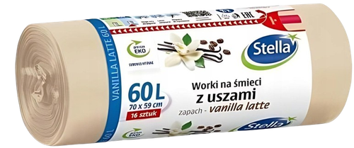 🧴 Opakowanie i jakość Opakowanie zawiera 16 zapachowych worków z uszami o pojemności 60 L. Produkt marki STELLA, wykonany z wysokiej jakości folii LDPE z dodatkiem kompozycji zapachowej Vanilla Latte.