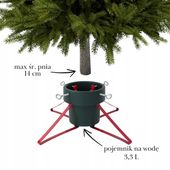 Szeroka podstawa o średnicy 57 cm z rozłożonymi nogami równomiernie dystrybuuje ciężar, co sprawia, że stojak jest niezwykle stabilny nawet pod ciężarem ozdób. Kolor zielony z czerwonymi akcentami dodaje świątecznego uroku, a możliwość przyklejenia filcowych podkładek chroni podłogę przed zarysowaniami.
