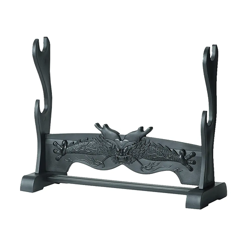 Stojak na dwa miecze ułożone poziomo. Stojak jest rozbieralny na części. Wykonany z tworzywa sztucznego PP Kolor: Czarny Odległość pomiędzy statywami 39 cm Wgłębienie w uchwycie na miecz pozwala na włożenie przedmiotu o maksymalnej średnicy 28 mm. Wymiary: wysokość 31 cm, długość 39 cm, szerokość 14,5 cm. Waga: 720 g