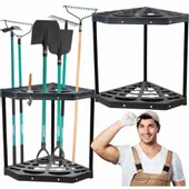 STOJAK NA NARZĘDZIA OGRODNICZE OGRODOWE NAROŻNY METALOWE NOGI 20 OTWORÓW to niezastąpiony element każdego ogrodu oraz garażu, który łączy w sobie funkcjonalność, bezpieczeństwo i estetykę. Dzięki zastosowaniu innowacyjnego projektu, ten solidny i elegancki stojak wykorzystuje przestrzeń narożną, co pozwala na efektywną organizację narzędzi i oszczędność miejsca.