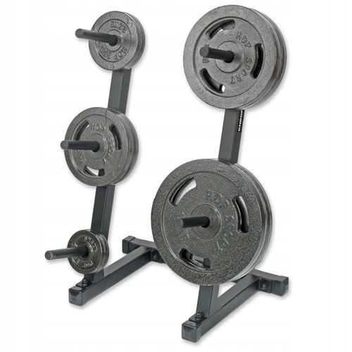 Stojak posiada aż 5 prętów do zawieszania talerzy obciążeń, rozmieszczonych w układzie 3+2, co umożliwia wygodne uporządkowanie zestawu ciężarków o różnych rozmiarach. Dodatkowo, odpowiednie nachylenie ramion zapewnia łatwy dostęp i komfort podczas treningu.