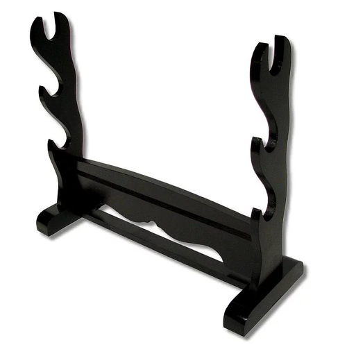 Stojak na trzy miecze ułożone poziomo. Stojak jest rozbieralny na części. Wykonany z drewna i malowany. Na kolor czarny Odległość pomiędzy statywami 37 cm Wgłębienie w uchwycie na miecz pozwala na włożenie przedmiotu o maksymalnej średnicy 28 mm. Wymiary: wysokość 34 cm, długość 40 cm, szerokość 15 cm.
