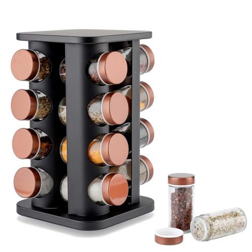 Stojak obrotowy na przyprawy z 16 szklanymi pojemnikami to funkcjonalne i eleganckie rozwiązanie, które pozwala mieć ulubione przyprawy zawsze pod ręką i dodaje porządku kuchennemu blatu.