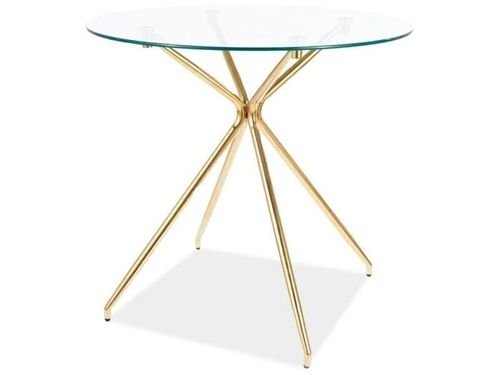 Jego szklany, okrągły blat ze szkła hartowanego i delikatna podstawa w złotym kolorze, połączone ze sobą w czterech punktach, tworzą niepowtarzalny styl glamour. Metalowe nogi, zwężające się ku dołowi, dodają mu lekkości i elegancji. Stół Azalis to nie tylko mebel, ale również dzieło sztuki, które przyciąga uwagę swoim unikalnym designem. Idealnie wpisuje się w trendy modern glamour, a jego transparentny kolor pozwala na swobodne łączenie z innymi elementami wystroju.