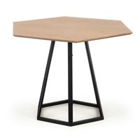 Stół Hexis - naturalny/czarny to mebel, który łączy w sobie wyjątkowy design oraz praktyczność, spełniając oczekiwania nawet najbardziej wymagających użytkowników. Jego sześcioboczny blat o wymiarach 110 cm wykonany z MDF z okleiną w kolorze naturalnym przyciąga wzrok i dodaje pomieszczeniu uroku oraz elegancji.