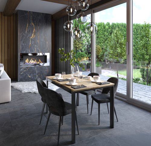 Blat stołu to wysokiej jakości płyta laminowana o grubości 22 mm, która cechuje się wysoką odpornością na uszkodzenia mechaniczne - pozwoli to zachować mebel w świetnym stanie przez długi czas. Stabilność całej konstrukcji zapewniają masywne, czarne nogi z metalu, pomalowane proszkowo na czarno. Rozsuwany blat, który można rozłożyć aż do 320 cm jest w stanie pomieścić nawet 12 osób i stworzyć magiczne miejsce do wspólnego biesiadowania.