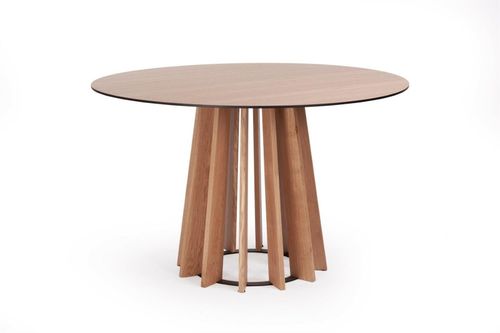 Mocny architektoniczny mebel Tavle stanie się centralnym punktem waszej jadalni. Wyjątkowa designerska forma oparta na bazie z litego dębu, otulonego malowaną proszkowo obręczą z metalu, zachwyci wszystkich gości. Będzie też wiernym towarzyszem codzienności. Okrągły blat o wyraźniej fakturze drewna powstał z płyty MDF o grubości 18 mm i pokryty jednostronnie dębowym fornirem. Naturalna powierzchnia pokryta została lakierem bezbarwnym, G10. Od spodu blat oklejony został natomiast papierem przeciwprężnym, który niweluje naprężenia powstałe po zalaminowaniu górnej części i chroni blat przed odkształcaniem oraz wilgocią. Spód blatu pokryty został natomiast czarnym lakierem, G10.