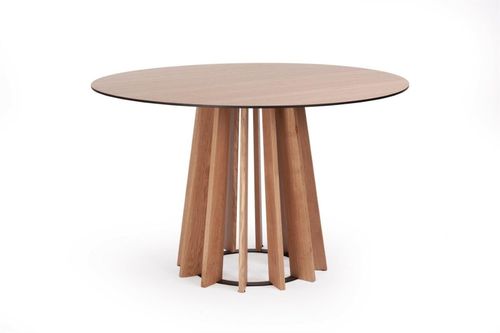 Mocny architektoniczny mebel Tavle stanie się centralnym punktem waszej jadalni. Wyjątkowa designerska forma oparta na bazie z litego dębu, otulonego malowaną proszkowo obręczą z metalu, zachwyci wszystkich gości. Będzie też wiernym towarzyszem codzienności. Okrągły blat o wyraźniej fakturze drewna powstał z płyty MDF o grubości 18 mm i pokryty jednostronnie dębowym fornirem. Naturalna powierzchnia pokryta została lakierem bezbarwnym, G10. Od spodu blat oklejony został natomiast papierem przeciwprężnym, który niweluje naprężenia powstałe po zalaminowaniu górnej części i chroni blat przed odkształcaniem oraz wilgocią. Spód blatu pokryty został natomiast czarnym lakierem, G10.