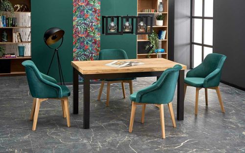 Blat stołu Tiago został wykonany z trwałej płyty meblowej laminowanej, co sprawia, że jego utrzymanie w czystości jest niezwykle proste. Naturalny kolor dębu nadaje mu eleganckiego i ponadczasowego charakteru, idealnie komponując się z różnymi stylami aranżacyjnymi.