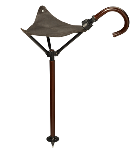 Praktyczna laska z blokadą w kształcie dzwonka i siedziskiem z prawdziwej skóry. Z płaską końcówką, idealną na miękkie i błotniste podłoże leśne. Wysokość siedziska: 70 cm.