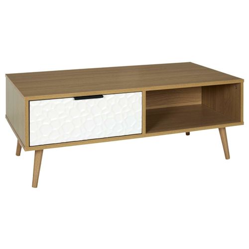 Jednym z mebli kolekcji jest STOLIK KAWOWY CARTA. Sprawdzi się on doskonale w obszernym salonie ustawiony przy sofie. Niski stolik kryje w sobie szufladę oraz półkę, które pozwolą na przechowywanie potrzebnych przedmiotów zawsze pod ręką, jednak nie na widoku gości. Front szuflady to płyta MDF ozdobiona białą okleiną z nowoczesnym wzorem oraz czarnym metalowym uchwytem. Korpus stolika to również płyta MDF w kolorze drewna, którą wyróżnia duża wytrzymałość na zarysowania i łatwość w pielęgnacji. Całość podtrzymują cztery drewniane nogi. Stolik kawowy pasuje do innych mebli z kolekcji o tej samej nazwie.