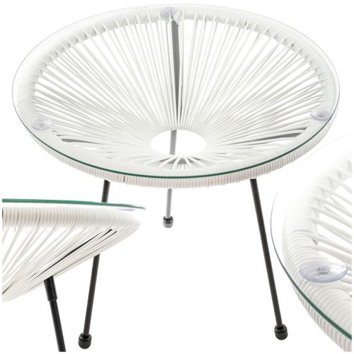 Stolik wykonany jest z wytrzymałego technorattanu, co zapewnia nie tylko trwałość, ale także wygodę użytkowania. Blat stolika został zrobiony z przezroczystego szkła, dzięki czemu jego powierzchnia jest bardzo praktyczna.