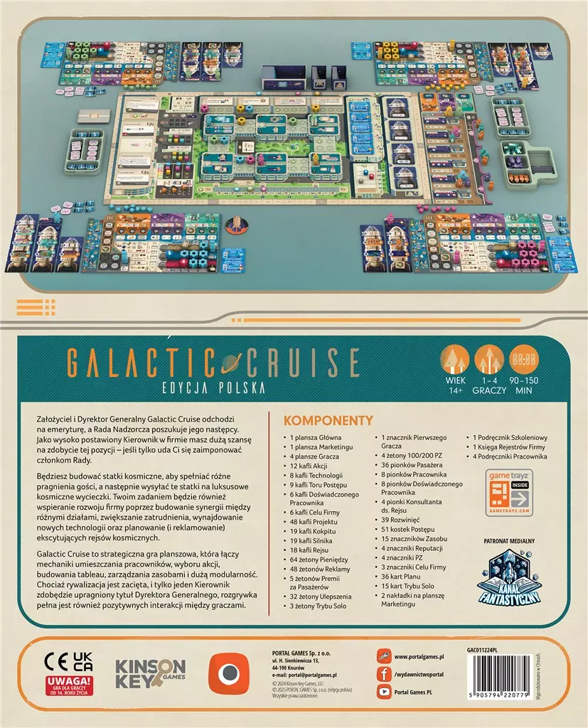Twoja misja? Nie tylko budować statki kosmiczne i spełniać potrzeby wymagających pasażerów, ale także rozwijać naszą firmę, opracowywać nowe technologie, budować rozwiniętą sieć połączeń i rekrutować najlepszych specjalistów. To jednak nie wszystko – aby zostać nowym Dyrektorem Generalnym Galactic Cruise, musisz zaimponować Radzie Nadzorczej i zdobyć najwięcej Punktów Zwycięstwa. A konkurencja jest zaciekła, bo każdy z pozostałych kierowników również liczy na ten awans!