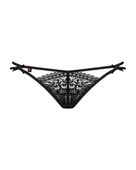 Obsessive Intensa podwójne stringi – kwintesencja kobiecej zmysłowości zamknięta w ozdobnych stringach na cienkich sznureczkach. Intensa to elegancka bielizna wykonana z miękkiego, koronkowego materiału w kolorze czarnym o motywie kwiatowym. Dodatkową ozdobą majteczek są dwie satynowe kokardki umieszczone z przodu oraz jedna – większa z tyłu ponad pośladkami. Pikanterii dodają dodatkowe paski biegnące przez szerokość pośladków. Obsessive Intensa prezentuje się świetnie na większości kobiecych kształtów. W składzie materiału znajdziemy 83% poliamid, 17% elastan.