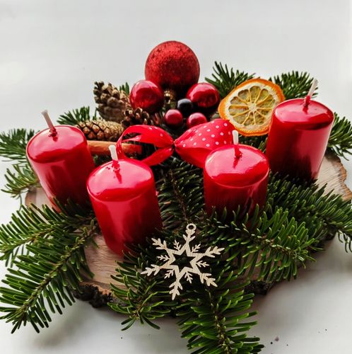✔️ Ozdobiony czterema stabilnie osadzonymi, czerwonymi świecami, które rozświetlą wnętrze ciepłym blaskiem i wprowadzą świąteczny nastrój.