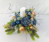 Wyjątkowy, ręcznie wykonany stroik bożonarodzeniowy ułożony w eleganckiej ceramicznej doniczce w odcieniu szaroniebieskim. Kompozycja zachwyca połączeniem głębokiego granatu, połyskującego złota oraz świeżości zimowej zieleni. Idealna dekoracja na świąteczny stół, komodę lub do eleganckiego holu.