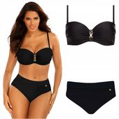 Ten czarny strój kąpielowy to kwintesencja stylu i elegancji. Przepiękna bardotka z usztywnianymi miseczkami i fiszbinami idealnie modeluje biust, nadając mu pełną i ponętną formę. Z kolei wysokie majtki doskonale podkreślają talię i nogi, tworząc niezwykle seksowną i kobiecą sylwetkę.