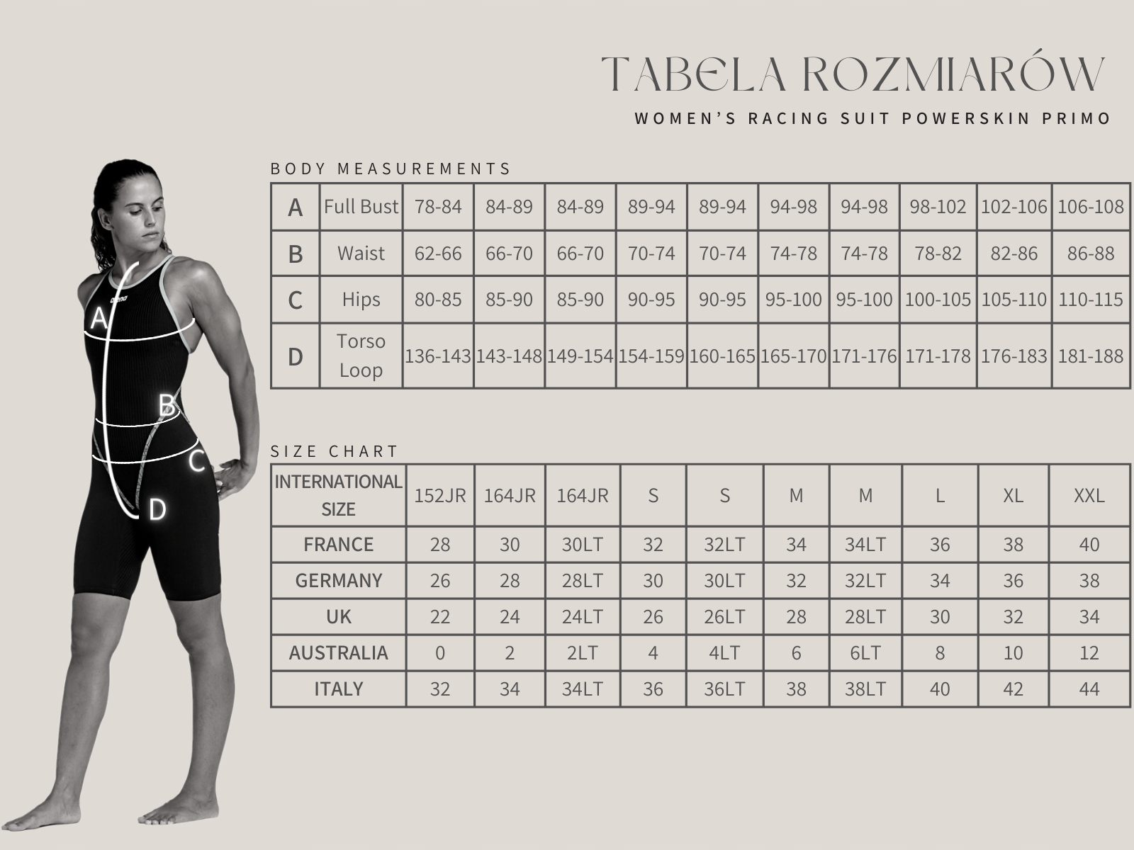 Powerskin Primo to pierwszy tensoelastyczny kombinezon wyścigowy zaprojektowany tak, aby zapewnić wszystko, czego potrzebuje pływak w jednym kombinezonie: najwyższą kompresję na całej powierzchni, najwyższy komfort i doskonałą hydrodynamikę. Powerskin Primo został zaprojektowany tak, aby zapewnić zarówno wsparcie mięśni, jak i elastyczność, dzięki Hyperforce ™ – pierwszemu w historii materiałowi Tensoelastic. Zapewnia największy zakres ruchu w wodzie oraz ułatwia codzienne treningi: elastyczność materiału sprawia, że jest to kombinezon o wysokim stopniu kompresji, który można założyć w czasie krótszym niż 5 minut. Unikalna powierzchnia tkaniny kanałowej poprawia hydrodynamikę i zmniejsza opór powierzchniowy, zapewniając maksymalną prędkość i usprawnioną wydajność na wodzie i pod wodą.