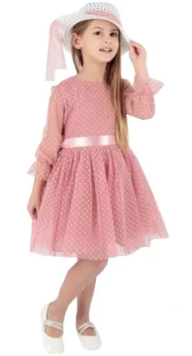 Ten wysokiej jakości komplet dziewczęcy "Miss Lady" zachwyca swoją wyjątkową konstrukcją. Sukienka z długim, tiulowym rękawkiem, odcinana i marszczona w pasie, z warstwą sztywnego, gładkiego tiulu oraz dodatkowymi akcentami w postaci drobnych groszkowych wzorów, sprawia, że cała stylizacja nabrała niepowtarzalnego charakteru.
